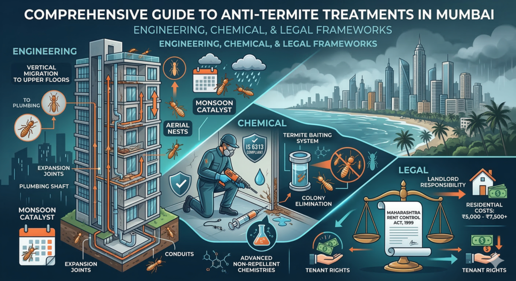 Termites are responsible for massive structural degradation globally, inflicting billions of dollars in economic damage annually. In the dense urban environment of Mumbai, the ecological conditions are exceptionally conducive to subterranean termite proliferation. The city’s coastal geography, high relative humidity, and intense monsoon seasons provide the requisite moisture and temperature for colonies to thrive. While urbanization has largely displaced natural woodland habitats, termites have aggressively adapted to the built environment, utilizing the structural timber, paper, and cellulose materials present in residential and commercial buildings as their primary sustenance. Managing this threat requires a comprehensive understanding of architectural vulnerabilities, stringent adherence to standardized chemical protocols, and clarity regarding property law.